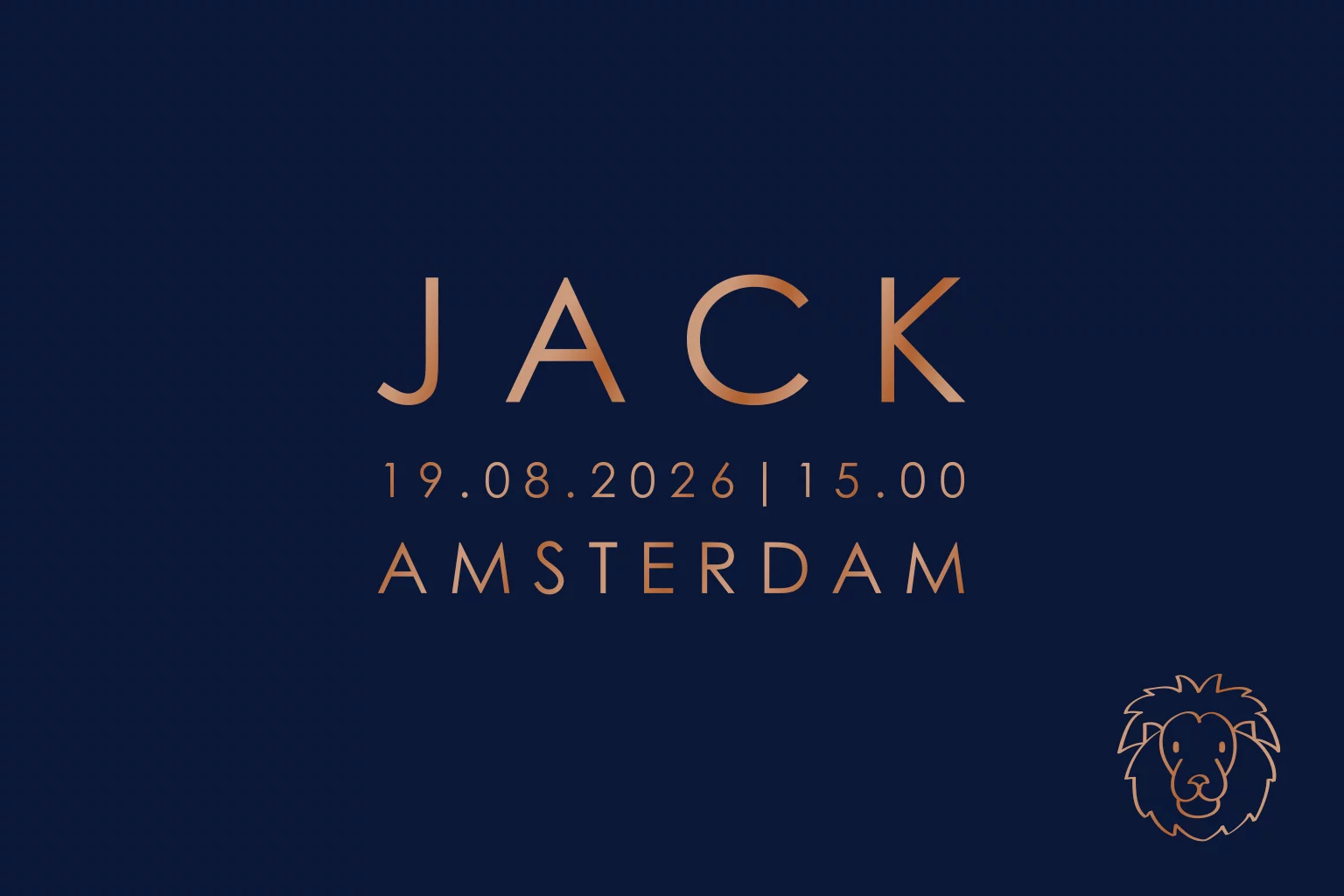Donkerblauw geboortekaartje met leeuw in koper look letters in glanzende lak.