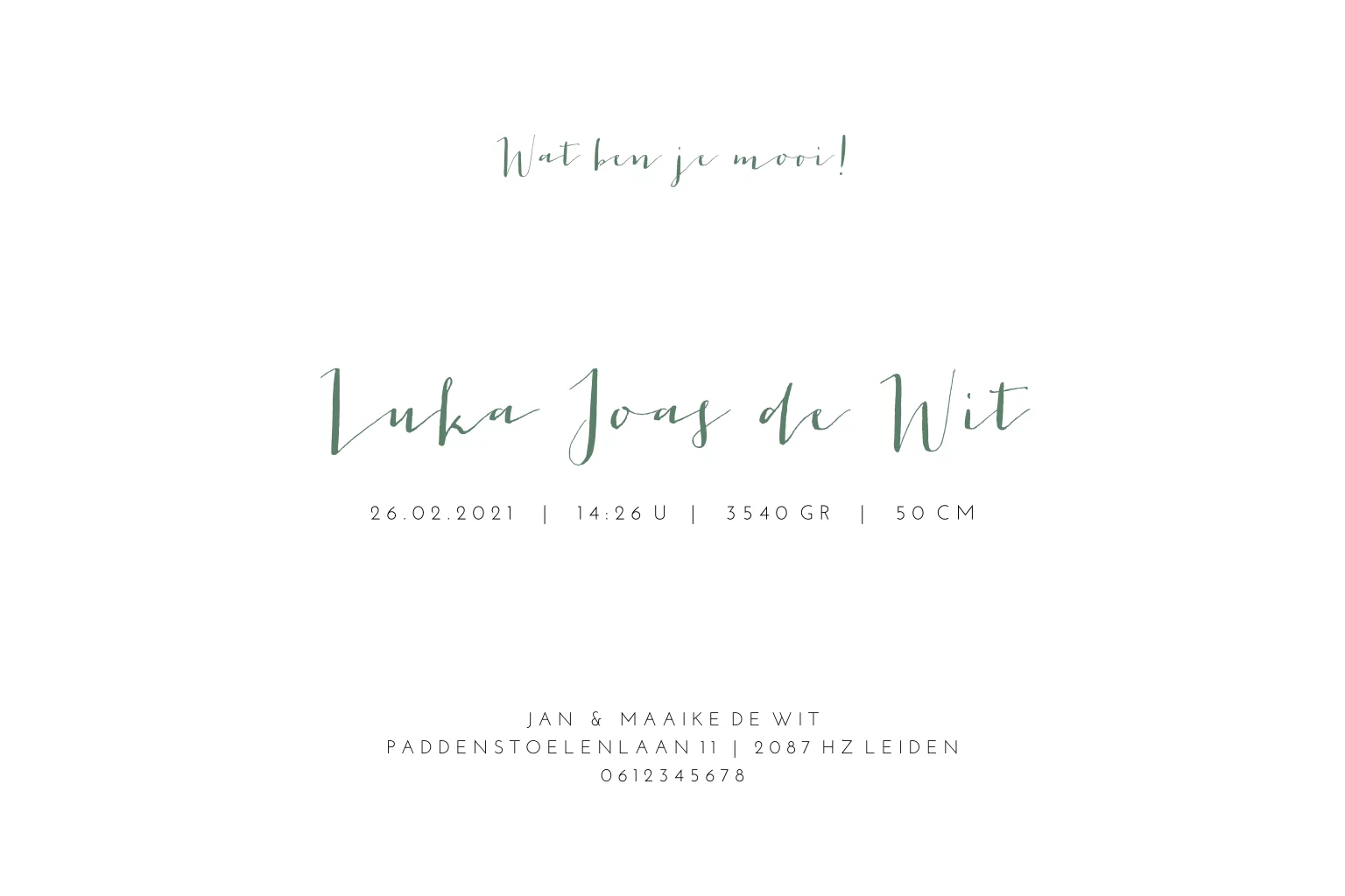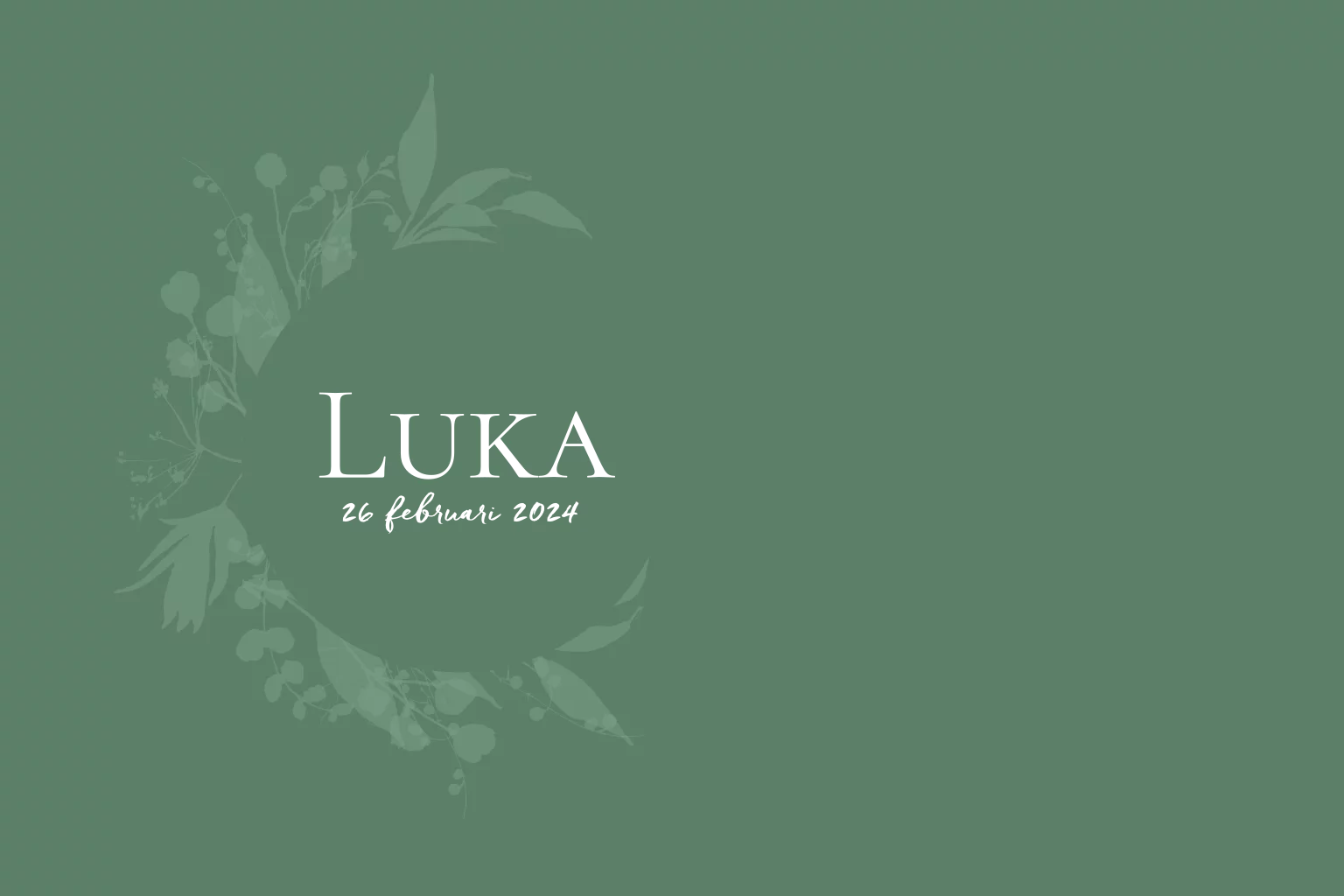 Geboortekaartje met groene bladerkrans en goudfolie naam