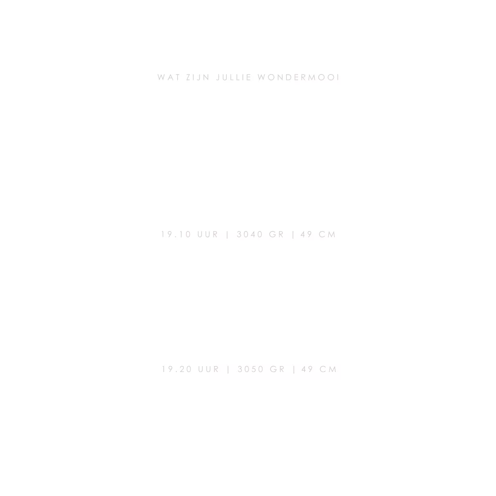 - Marloes“Ruime keuze uit geboortekaartjes die passen bij het seizoen, heel fijn dat je ze zelf kan aanpassen naar smaak. We hadden alles klaar staan en hoefde alleen nog geboorteinfo aan te passen. Daardoor waren de kaartjes al op dag 3 na de geboorte in huis! Superfijn.”