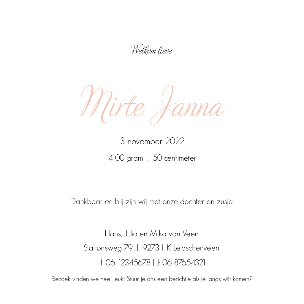 - Marloes“Ruime keuze uit geboortekaartjes die passen bij het seizoen, heel fijn dat je ze zelf kan aanpassen naar smaak. We hadden alles klaar staan en hoefde alleen nog geboorteinfo aan te passen. Daardoor waren de kaartjes al op dag 3 na de geboorte in huis! Superfijn.”