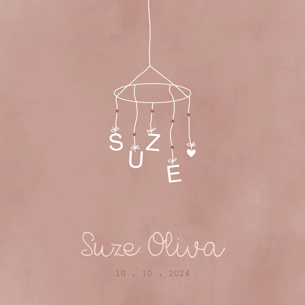 Geboortekaartje met mobiel met letters in goudfolie. Er kunnen 5 letters aan hangen. Heb jij een naam met meer letters? Mail ons dan! Dan hangen wij er extra touwtjes aan!