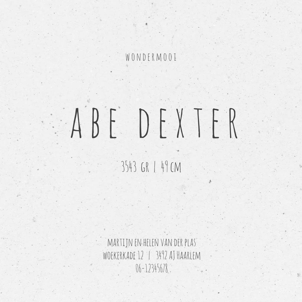 - Marloes“Ruime keuze uit geboortekaartjes die passen bij het seizoen, heel fijn dat je ze zelf kan aanpassen naar smaak. We hadden alles klaar staan en hoefde alleen nog geboorteinfo aan te passen. Daardoor waren de kaartjes al op dag 3 na de geboorte in huis! Superfijn.”