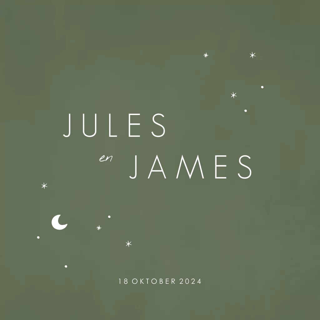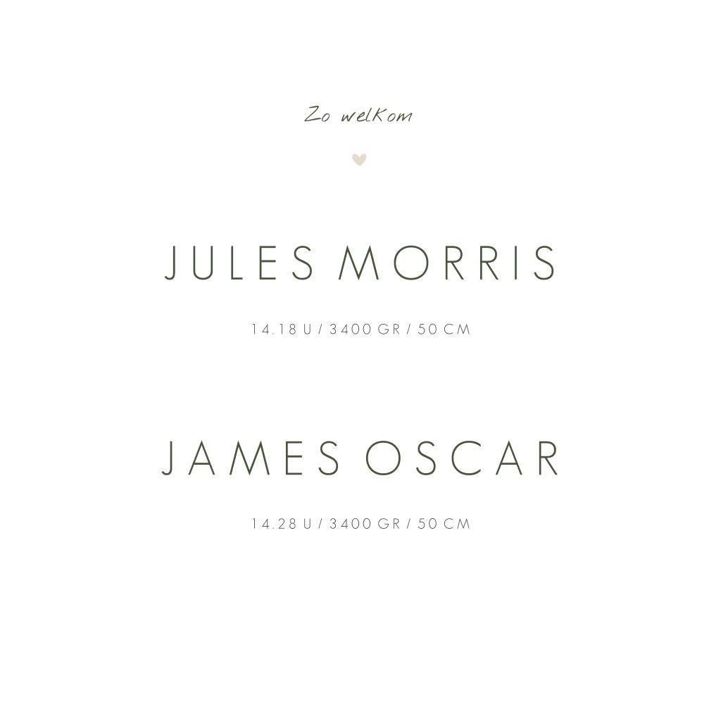Geboortekaartje voor een jongens tweeling. Het kaartje heeft een stoere groene kleur met gouden opdruk aan de voorzijde. Mooi op linnen papier!