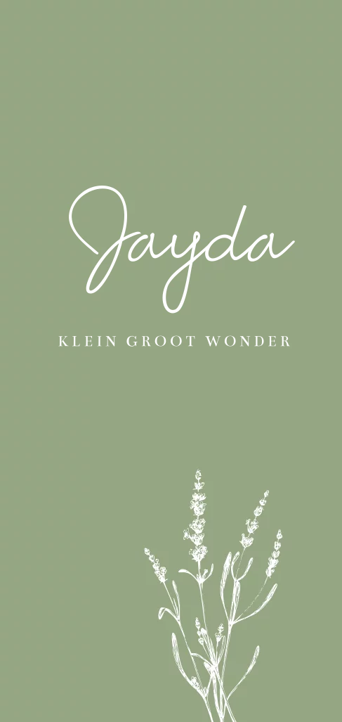 Geboortekaartje groen met witte veldbloemen en goudfolie letters