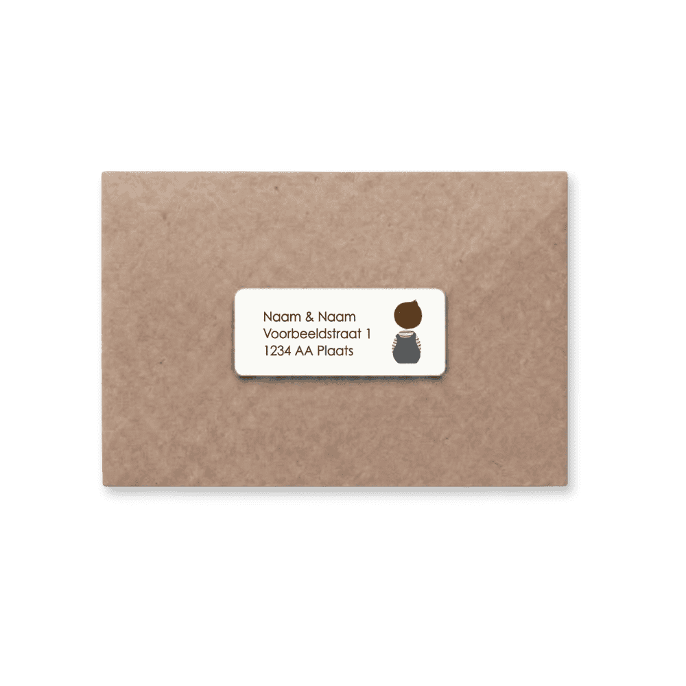 Adresstickers voor bij je geboortekaartje met illustratie van jongetje met donker haar. Maak je geboortepost helemaal af met bijpassende adresstickers.