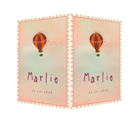 Raambord in stijl van het geboortekaartje. met een luchtballon vliegend door de blauwe en roze wolken.