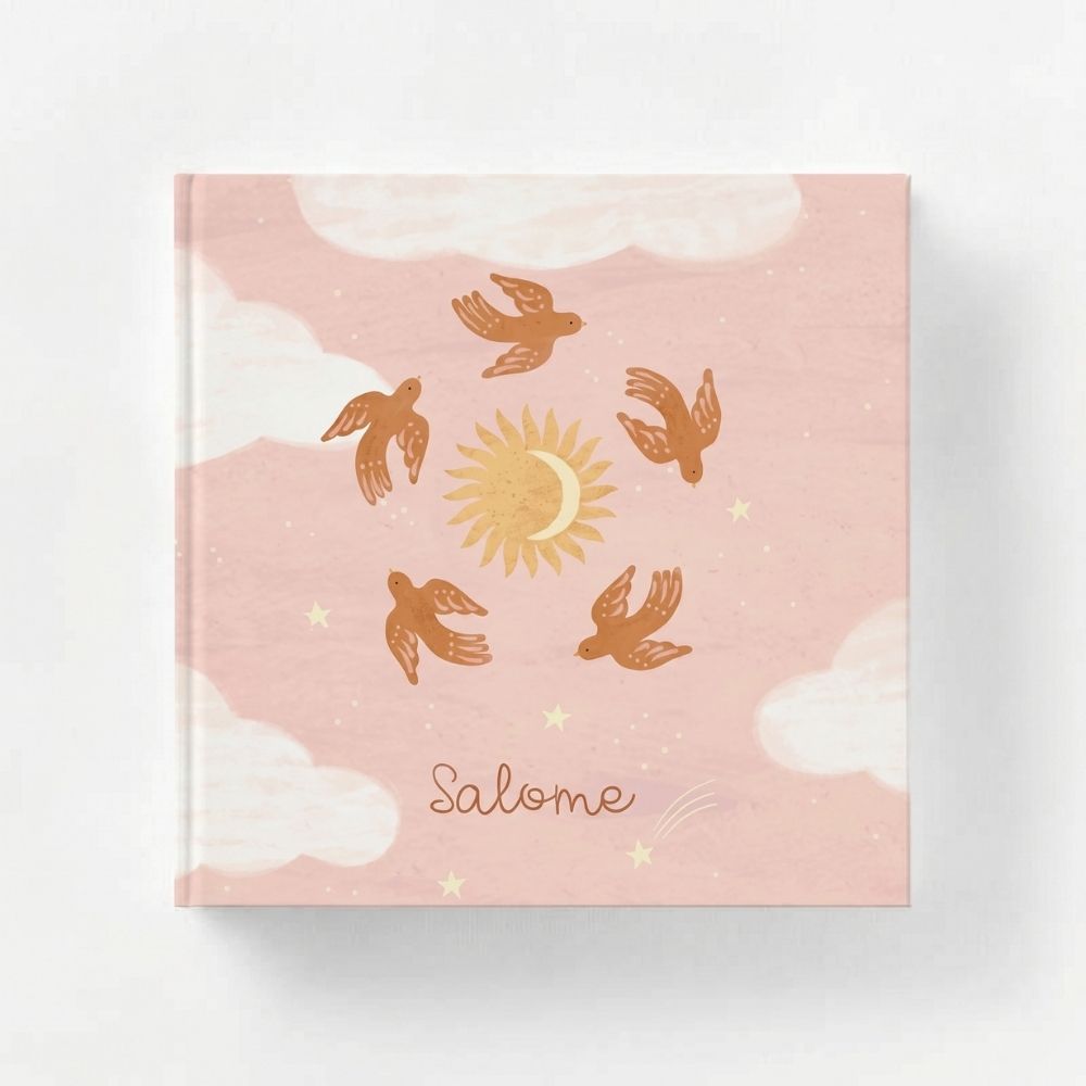 Kraambezoekboek op basis van het geboortekaartje. Een ontwerp in zachte roze tinten met lieve illustraties van vogels en een zonnetje. Onderdeel van onze collectie Studio Dijs x Froukje. Je past het ontwerp eenvoudig aan in onze online ontwerptool. Hulp nodig? Mail ons gerust, we helpen je graag.