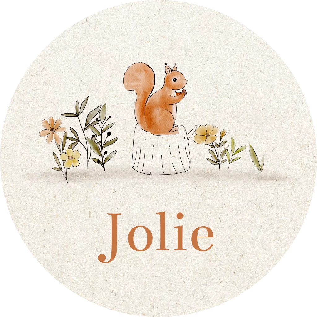 25 geboorte stickers met een eekhoorntje tussen de bloemetjes.
