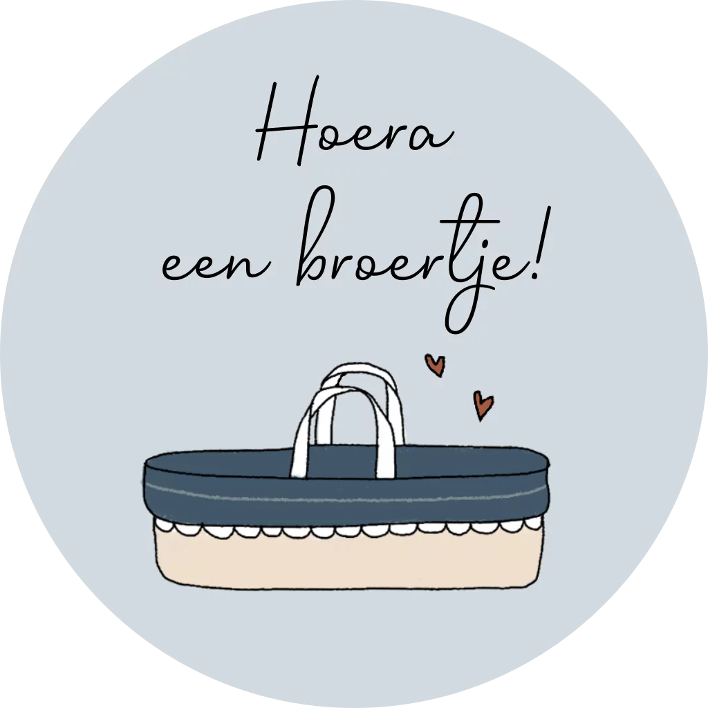 Blauwe sticker met blauwe achtergrond en een mozesmandje. Ideaal voor grote broers en zussen om geboorte traktaties uit te delen op school of het kinderdagverblijf.