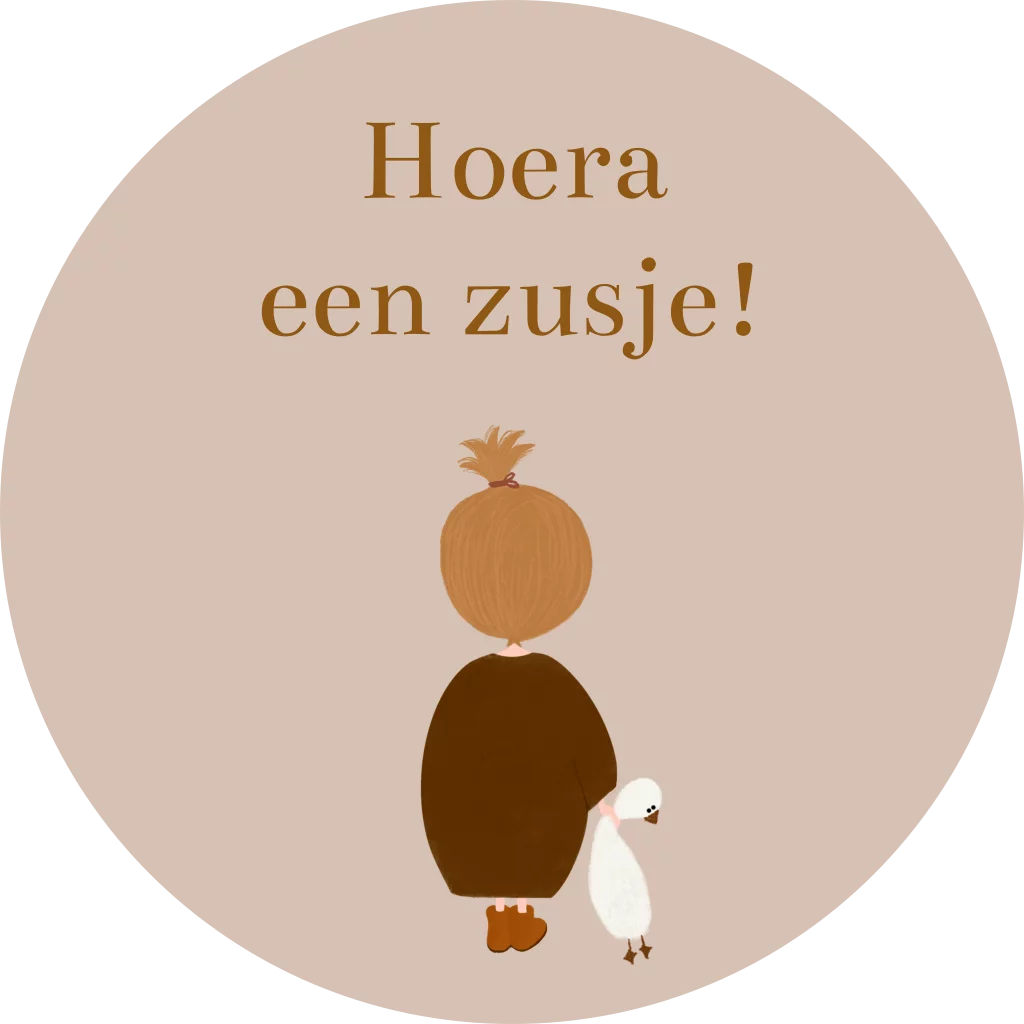 Sticker traktatie hoera een zusje blond meisje knuffel gans