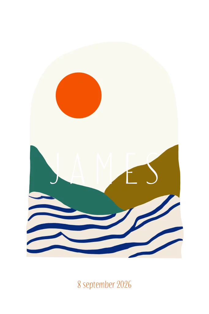 Abstract geboortekaartje met zon, zee en bergen in een moderne vorm.