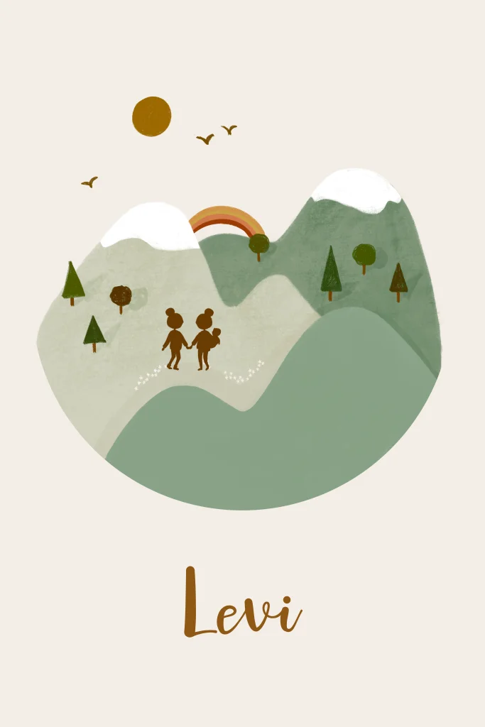 Geboortekaartje met gezin in de bergen. Silhouette van 2 moeders met hun zoontje en een mooie regenboog op de achtergrond Heb jij een andere gezinssamenstelling? Stuur dan een mailtje naar service@studiodijs.nl en wij passen het voor je aan!