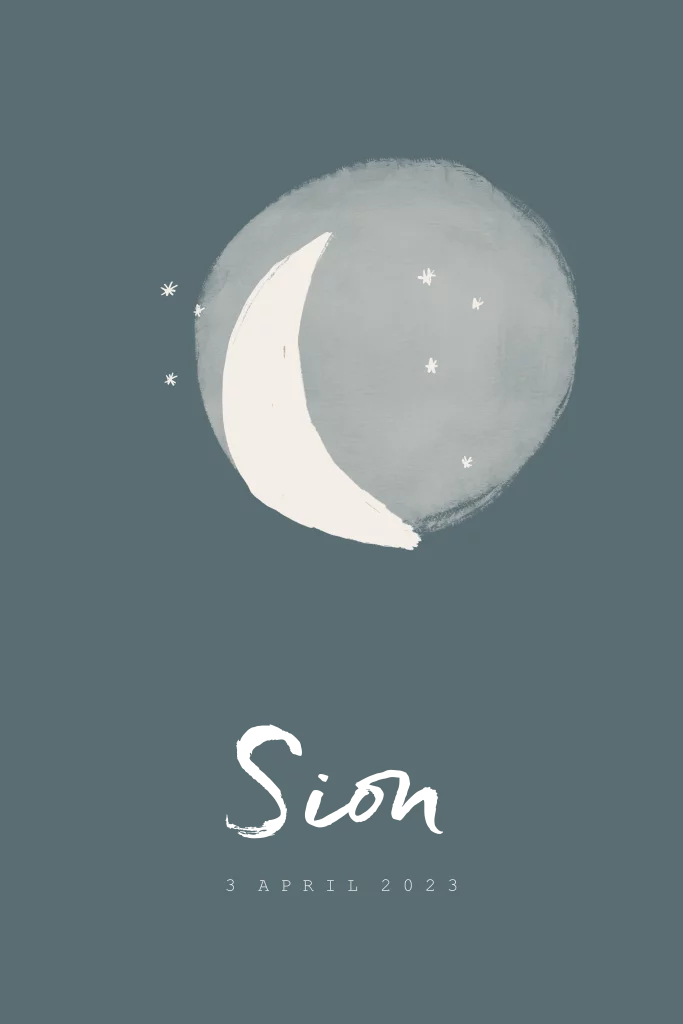 Geboortekaartje in mooie blauw tint met een unieke maan en sterretjes. De naam op de voorzijde staat in zilverfolie