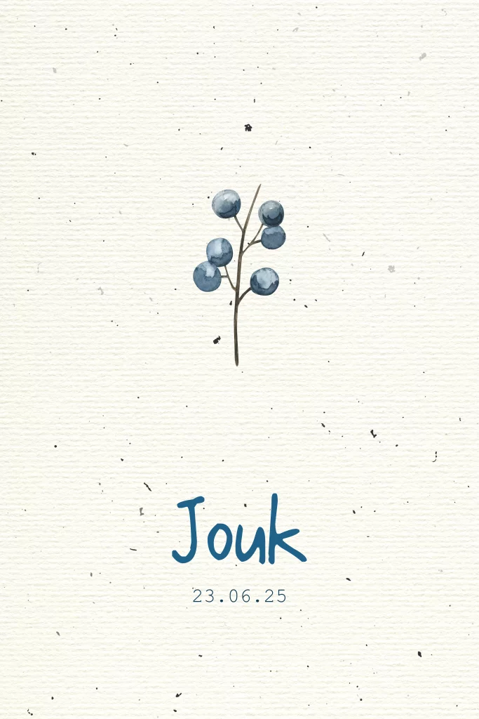 Een minimalistisch geboortekaartje met gevlekt papier look en een blauwe bes in watercolour. Bij dit kaartje adviseren we Oud Hollands papier voor een extra mooi effect van de achtergrond.