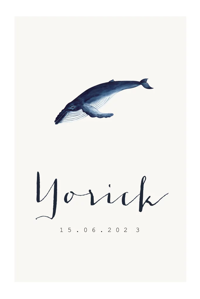 Stoer geboortekaartje met blauwe walvis in watercolor kleuren