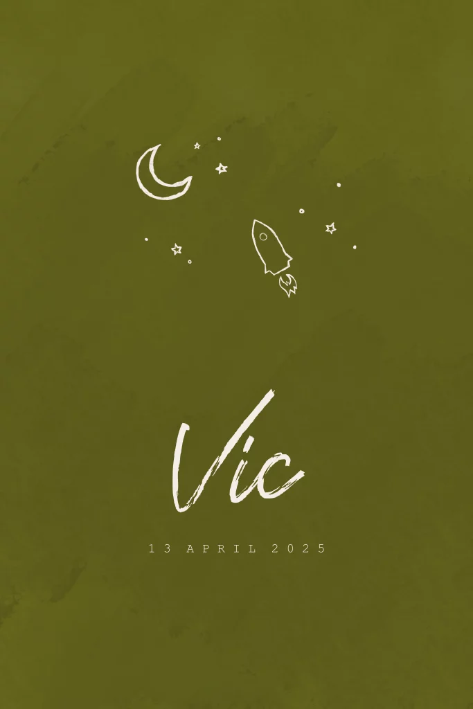 Groen geboortekaartje met maan, sterren en een raket. Het kaartje heeft een stoer getekende stijl.