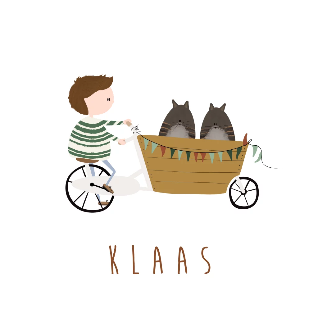 Een grappig geboortekaartje met een jongen op een bakfiets. In de bakfiets zitten zijn 2 katten. Heb jij andere huisdieren? Mail ons voor een aangepast ontwerp.