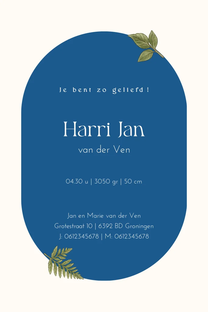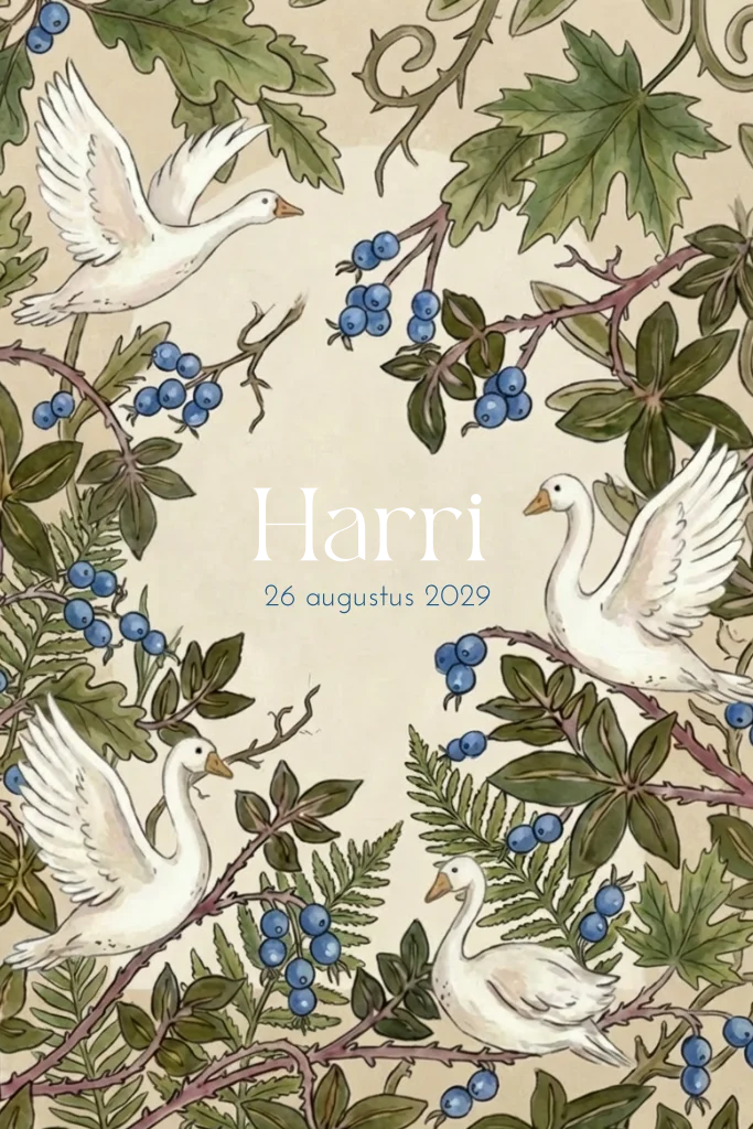 Uniek geboortekaartje voor jongens met een kleurrijk design vol takjes, blaadjes, ganzen en blauwe besjes. De naam op de voorzijde staat in goudfolie.