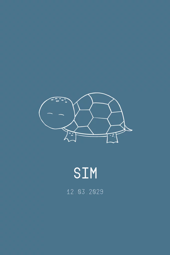 Lief geboortekaartje in een hippe blauwe kleur met een ondeugende schildpad.