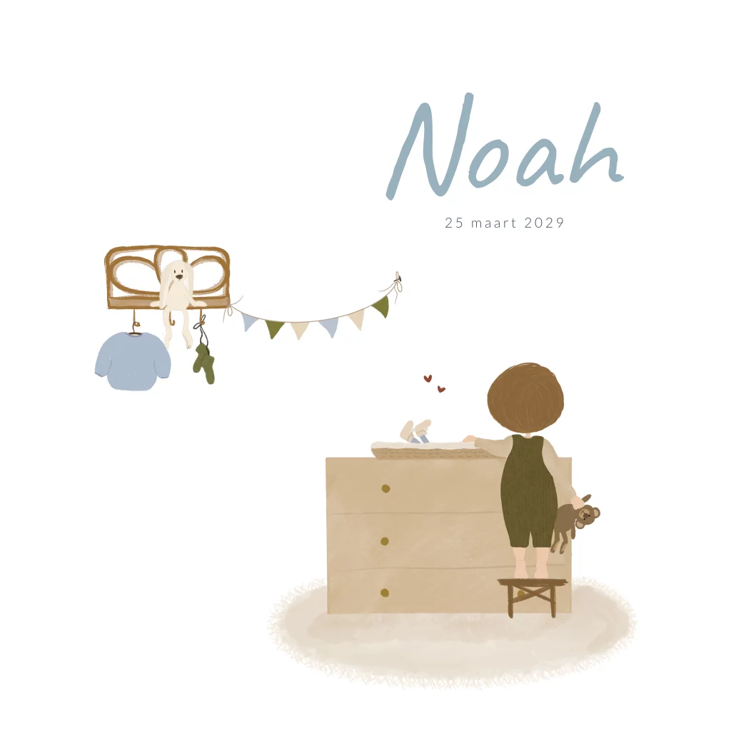 Een lief, grappig en eigenwijs geboortekaartje voor een jongen. Een kleine baby op de commode in de babykamer met Happy Horse konijn en beer. Met een nieuwsgierige grote broer op zijn tenen kijkend bij zijn kleine broertje.