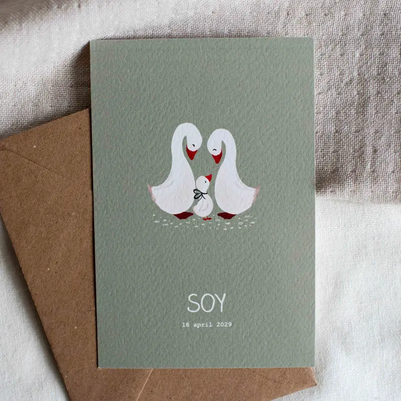 Een lief en schattig geboortekaartje met een baby gans kijkend naar zijn papa en mama.