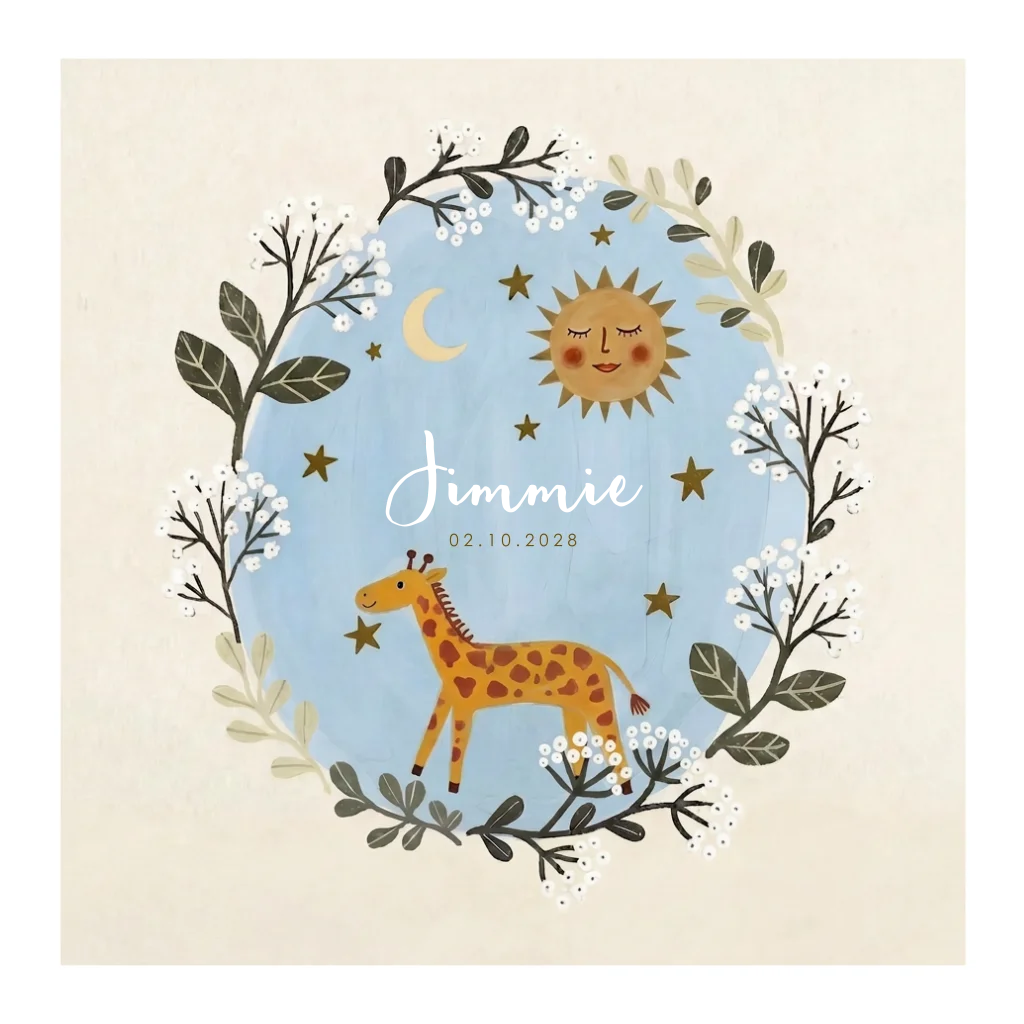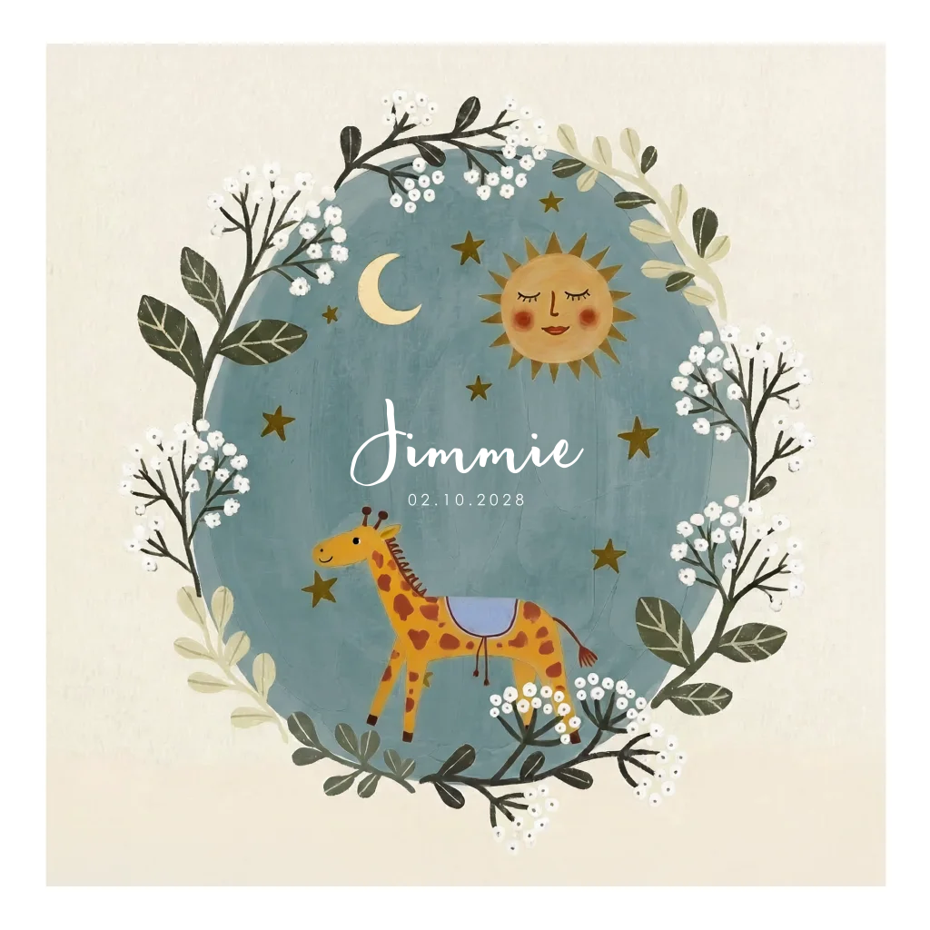 Geboortekaartje voor een jongen. In boho eclectische stijl. Met giraffen zon, maan, sterren en vrolijke bloemetjes.