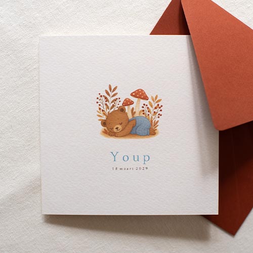Een schattig geboortekaartje voor een jongen met een slapend beertje tussen de paddenstoelen. Een passend geboortekaartje voor de herfst baby's.