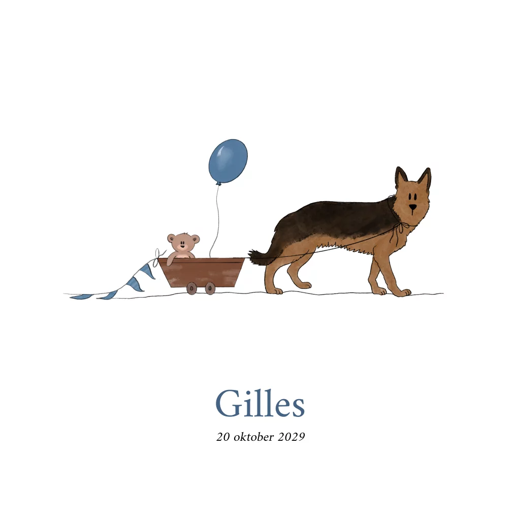 Geboortekaartje voor een jongen. Met een Duitse Herder die een bolderkarretje achter zich aantrekt. Met daarin een teddybeer, blauwe ballon en slingertjes.