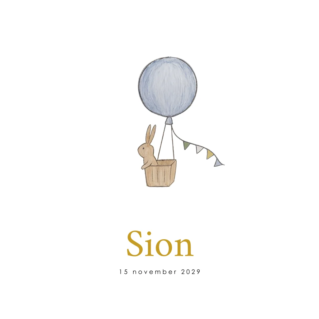 Geboortekaartje voor een jongen. Met een lieve illustratie van een konijntje in een luchtballon.