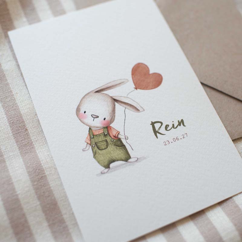 Lief geboortekaartje voor een jongen. Met een klein konijntje in een tuinbroekje met een ballon in zijn handjes in de vorm van een hart.