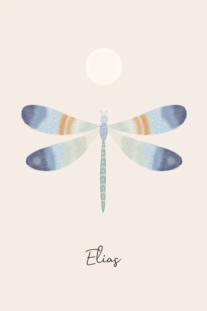 Een stijlvol en rustig geboortekaartje uit de collectie Studio Dijs x Froukje. Op de zachte beige achtergrond staat een grote, sierlijke libelle centraal, met subtiele kleuren in blauw, groen en warme tinten.