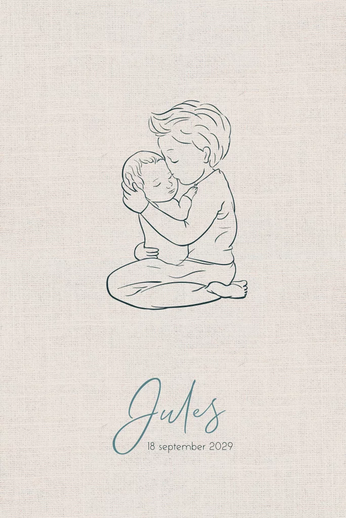 Lief geboortekaartje voor een jongen. Grote broer zit op zijn knietjes en heeft zijn kleine broertje in zijn armen. Een klein kusje op het voorhoofd. Een zoete lijntekening voor kleine broertjes.