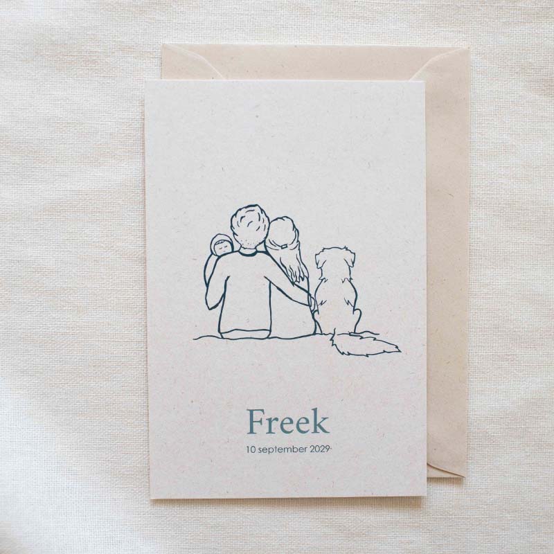 Geboortekaartje voor een jongen. Met een lijntekening van papa, mama, baby en een Golden Retriever.