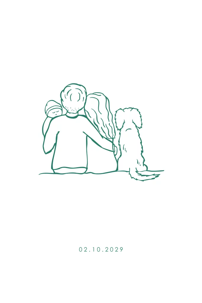 Geboortekaartje jongen lijntekening gezin hond Heidewachtel