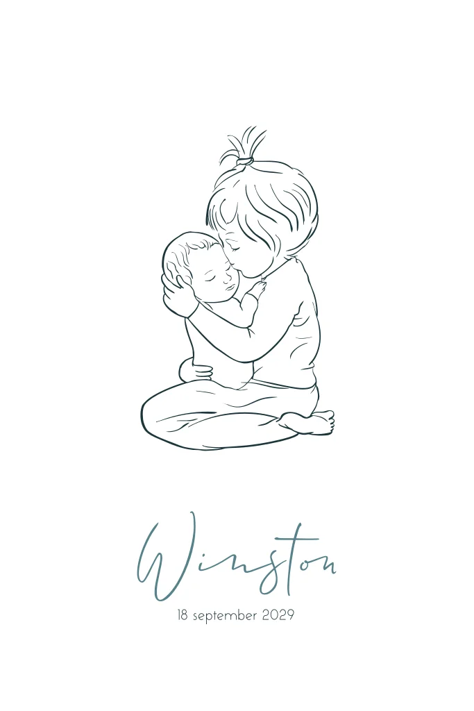 Lief geboortekaartje voor een jongen. Grote zus zit op haar knietjes en heeft haar kleine broertje in haar armen. Een klein kusje op het voorhoofd. Een zoete lijntekening voor kleine broertjes.