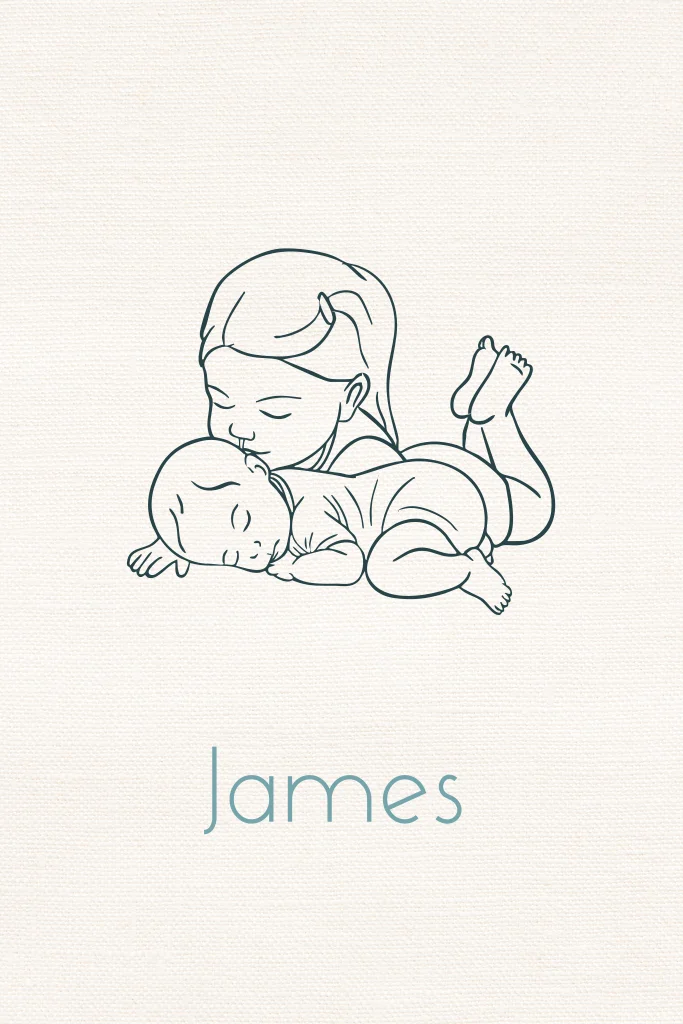 Lief geboortekaartje voor een jongen. Grote zus ligt op haar buik om haar kleine broertje een kusje te geven. Een zoete lijntekening voor kleine broertjes.
