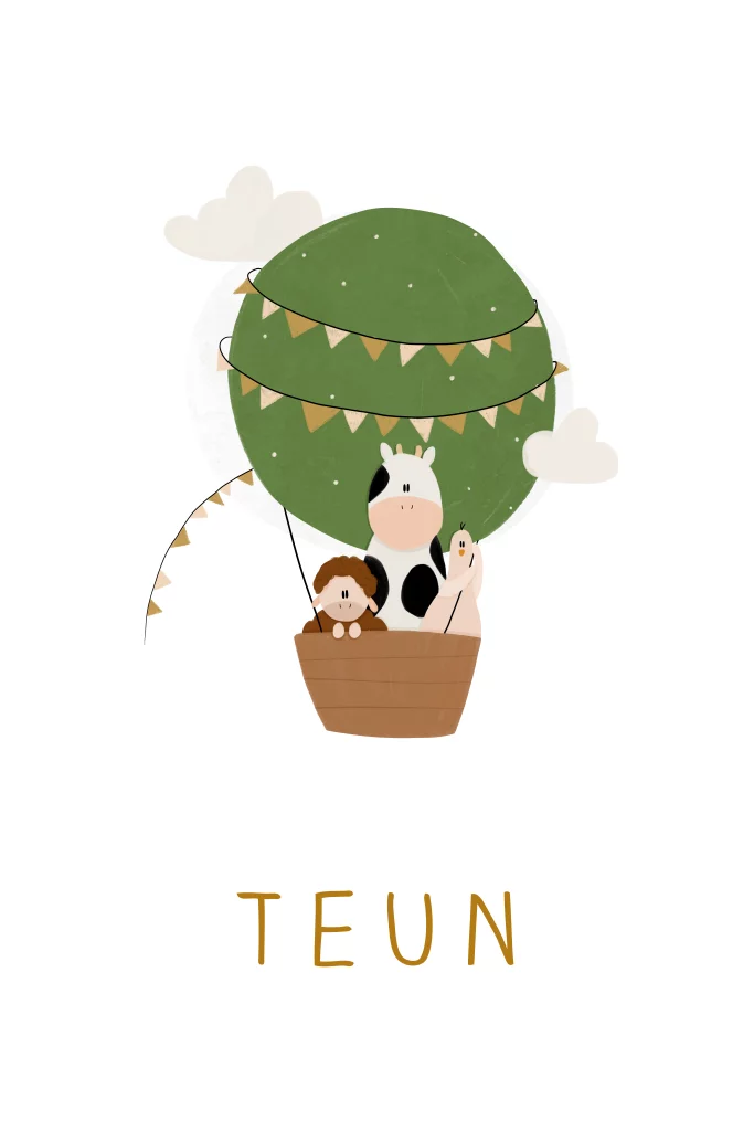 Een grappig geboortekaartje met een luchtballon met daarin 3 ondeugende dieren: een koe, schaap en gans.