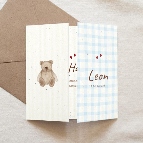 Lief geboortekaartje voor een jongen met blauwe ruitjes en een lieve knuffelbeer. Het kaartje heeft een tweeluik waardoor je het geboortekaartje op een originele manier openklapt.