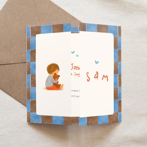 Geboortekaartje jongen luikvouw geblokt knuffelbeer