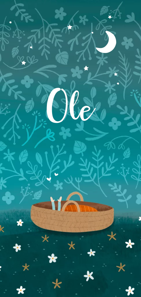 Grappig en kleurrijk geboortekaartje met een kleine baby in een wiegje onder de gouden sterrenhemel.
