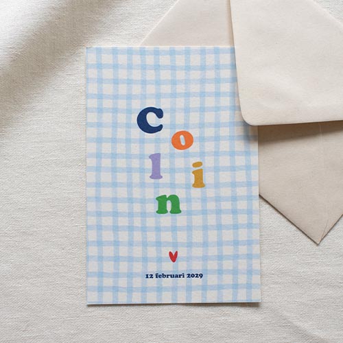Een vrolijk gekleurd geboortekaartje voor een jongen. Met blauw ruitjes patroon en gekleurde losse letters op de voorzijde.