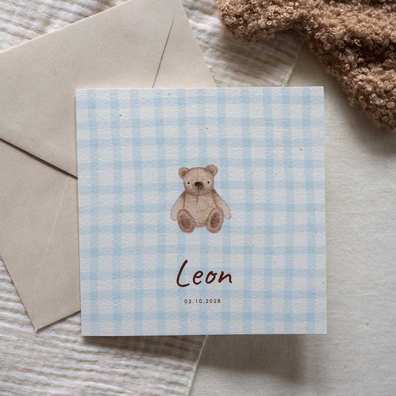 Geboortekaartje jongen teddybeer blauw ruitjes patroon