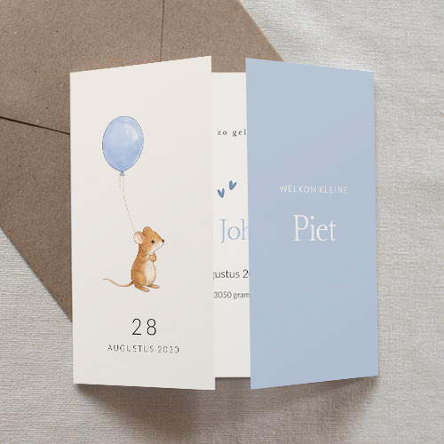 Geboortekaartje voor een jongen met een lief muisje met blauwe ballon. Het kaartje heeft een tweeluik waardoor je het geboortekaartje op een originele manier openklapt.
