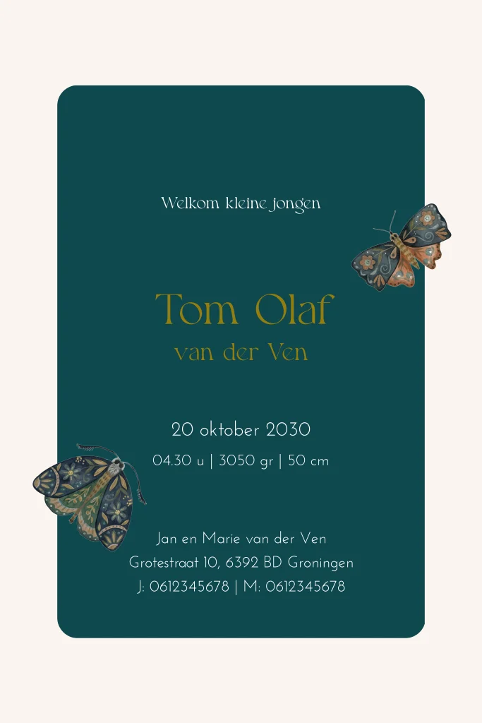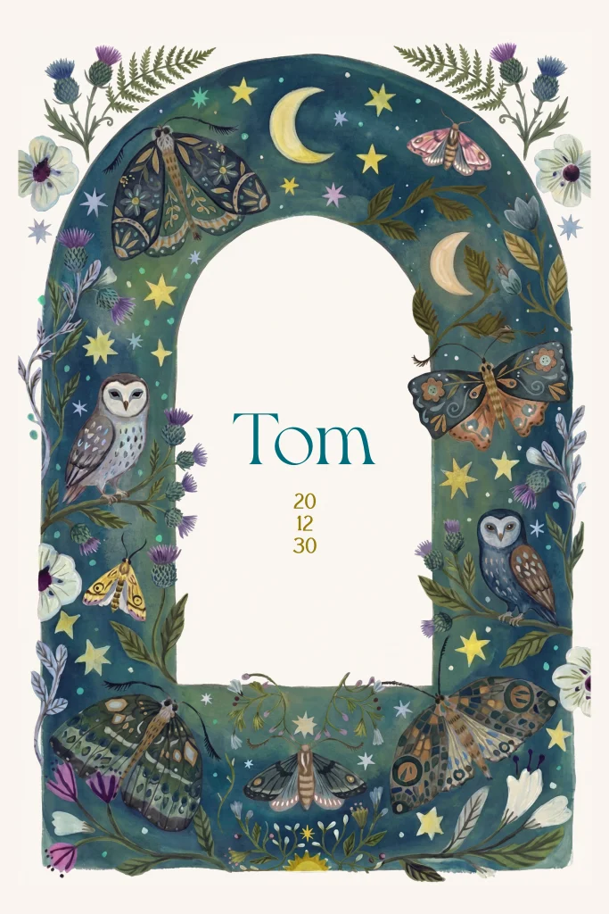 Een uniek geboortekaartje voor een jongen met zon, maan, sterren, uilen, bloemen en motjes / vlinders. Een kleurrijk en vrolijk patroon.