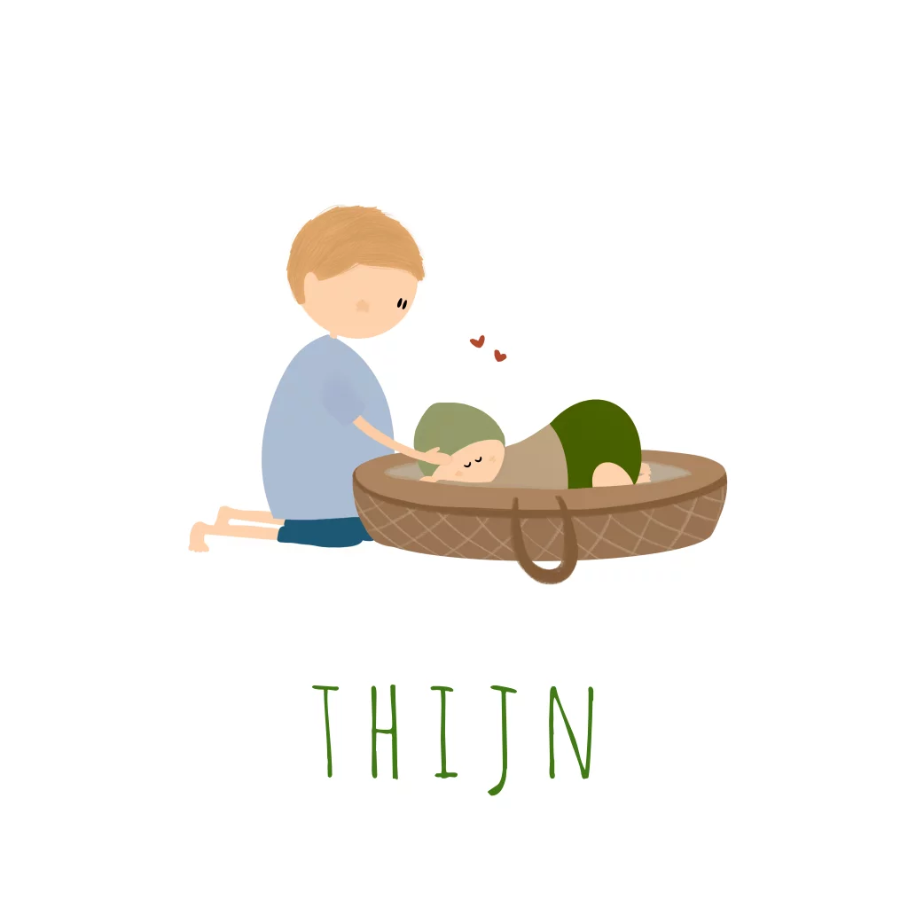 Een grappig geboortekaartje voor een jongen. Een klein broertje in een mozesmandje. De trotse grote broer kijkt nieuwsgierig in het wiegje naar zijn nieuwe broertje.