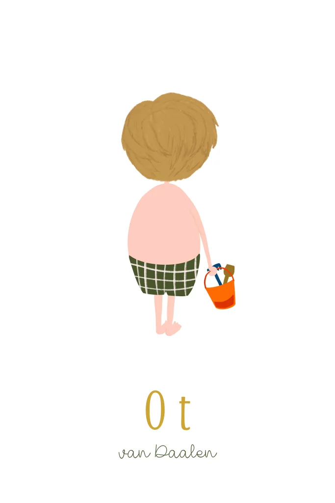 Een zomers geboortekaartje met een klein jongetje in een geruit zwembroekje. In zijn hand een emmer met harkje en schepje.