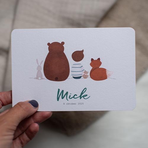 Grappig geboortekaartje met een kleine jongen met zijn knuffelbeertje, naast zijn dierenvrienden: konijn, beer en vos.