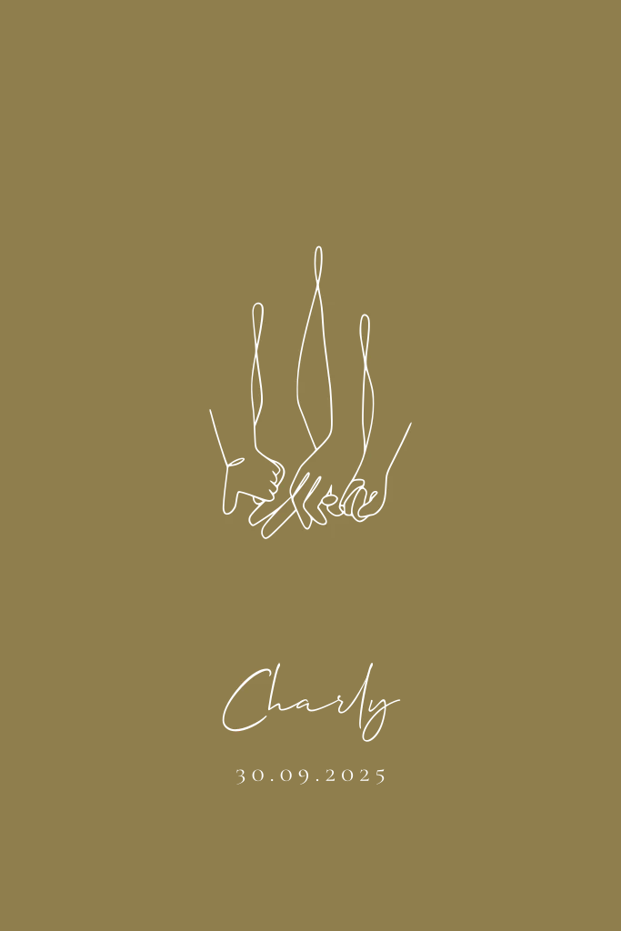 Geboortekaartje met een lijntekening van een vasthoudende familie van vier. De naam op de voorzijde is in goudfolie.