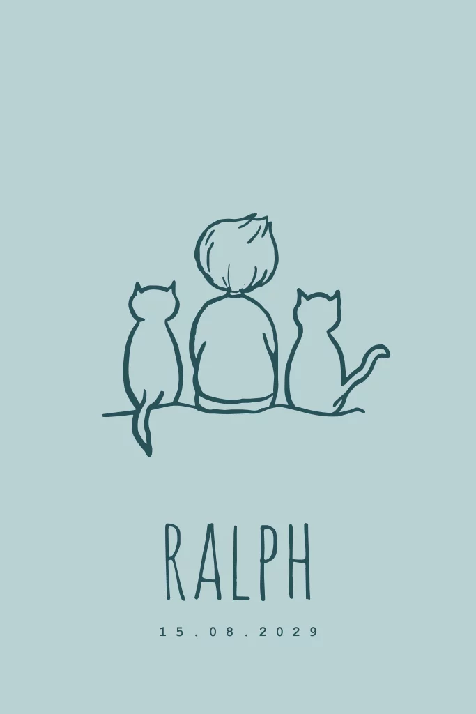 Geboortekaartje met een lijntekening van een klein jongetje en huisdieren, 2 poezen. Een lief en eigenwijs kaartje. Verander de kleur van de lijntekening, tekst en achtergrond eenvoudig in de online editor.