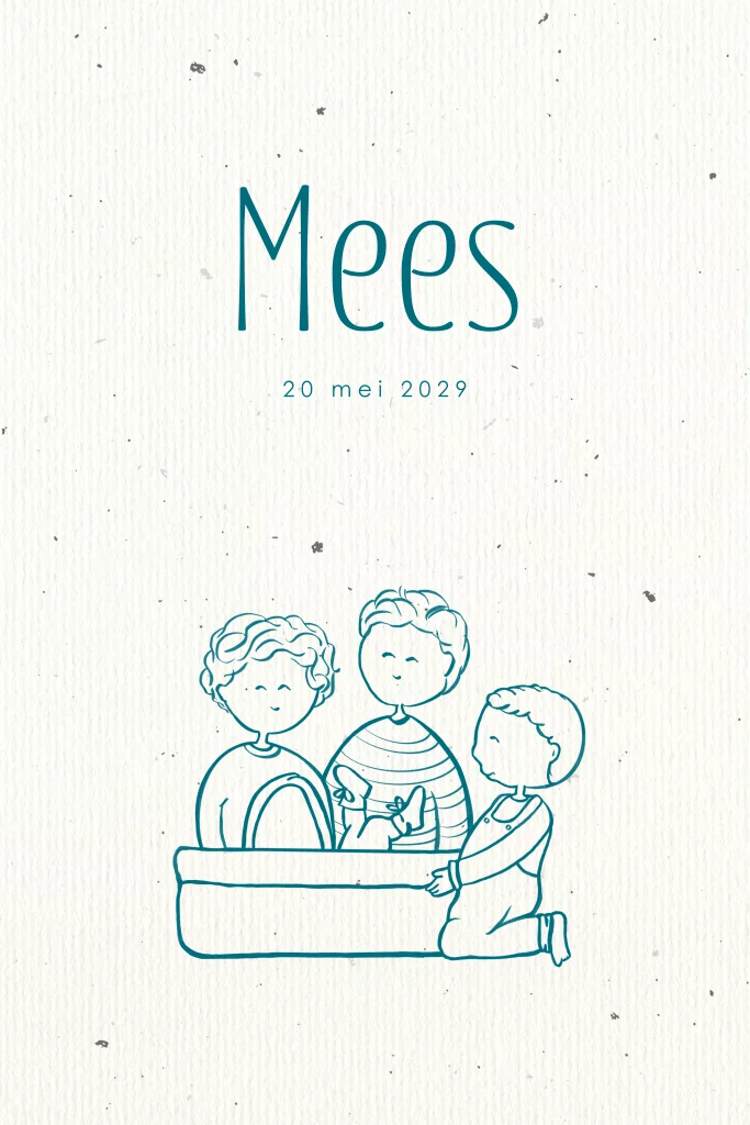 Geboortekaartje lijntekening vier broertjes mozesmandje